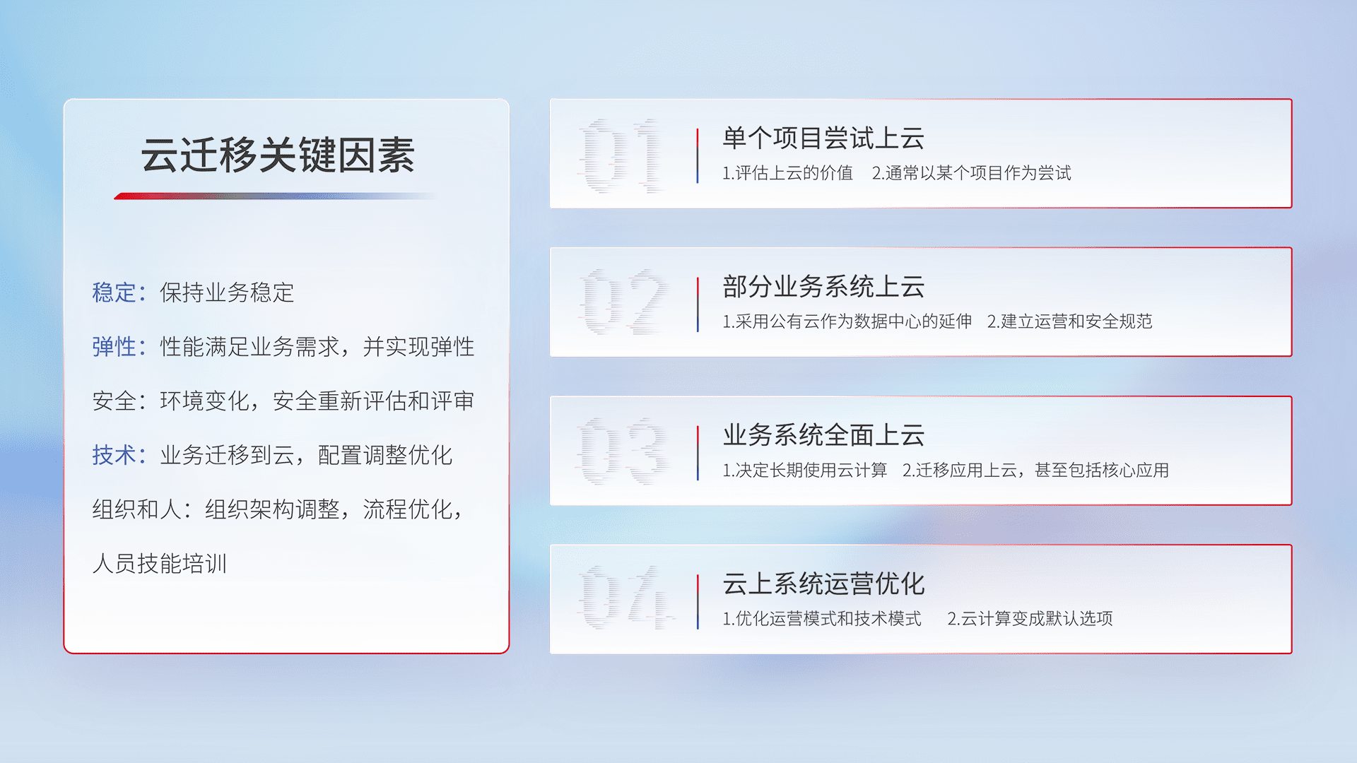 结合实际业务,,,,从规划设计、、、云平台选型、、、、云原生改造、、、、数据迁移、、集成交付,,,,迁移全过程为客户识别最佳上云路径,,,,做好风险识别管理,,设计网络架构、、、、身份权限、、、安全审计合规、、、操作审计、、日志审计、、、、监控告警策略、、多站点容灾设计等,,,对云上基础设施进行整体规划,,,,提升IT治理水平,,,,以满足弹性、、高可用、、、、高性能的需求。。