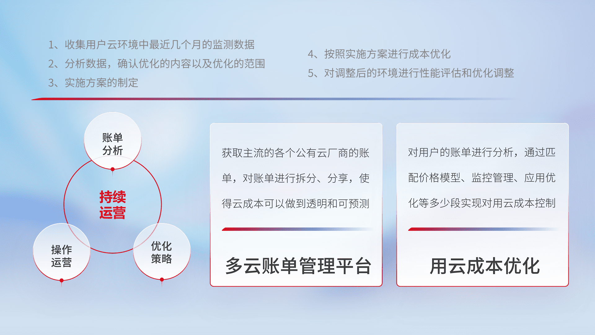 通过多云纳管,,以统一的资源数据模型把客户的云资源进行抽象和封装,,进而实现对多云资源的统一操作,,,保障云资源管理的可靠性、、、、稳定性与可用性。。量身定制化运维内容,,,配置、、、开发运维、、、补丁管理、、、、备份、、、监控、、认证和访问管理、、审计和日常巡检等,,保障在用云过程中的可靠度,,稳定度以及高可用率。。。。
