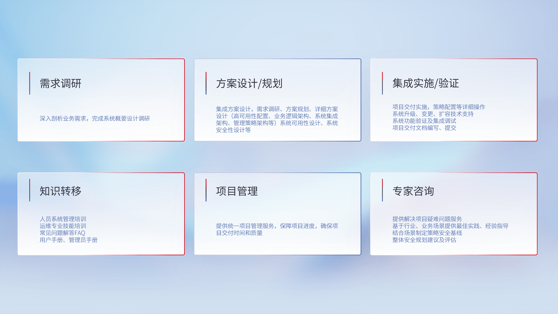 针对客户行业特性,,,将宏观的安全战略和需求,,,通过专业的交付服务,,,实现项目落地,,,,为客户提供标准规范的集成交付服务。。。。